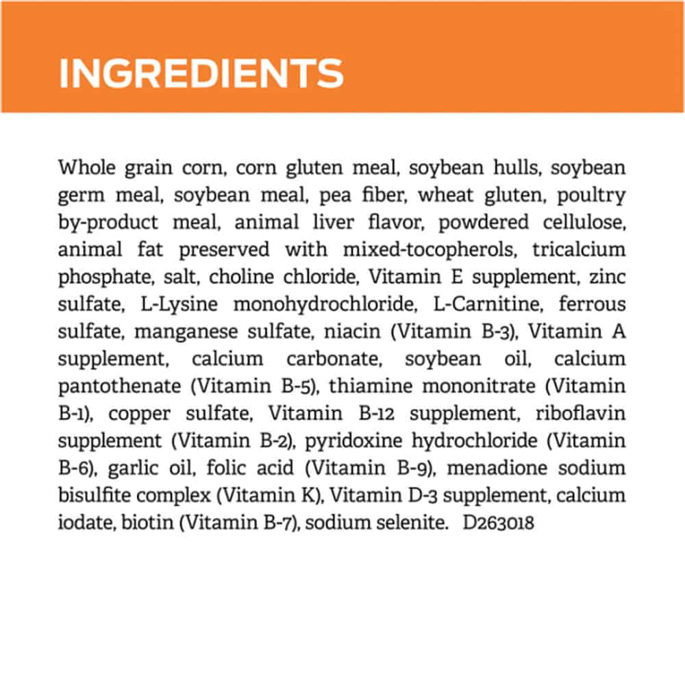 | Whole Grain Corn, Corn Gluten Meal, Soybean Hulls, Soybean Germ Meal, Soybean Meal, Glycerin, Pea Fiber, Wheat Gluten, Poultry By-Product Meal, Natural Flavor, Powdered Cellulose, Animal Fat Preserved With Mixed-Tocopherols, Tricalcium Phosphate, Salt, Choline Chloride, Vitamin E Supplement, Zinc Sulfate, L-Lysine Monohydrochloride, Ferrous Sulfate, L-Carnitine, Niacin (Vitamin B-3), Manganese Sulfate, Vitamin A Supplement, Calcium Carbonate, Soybean Oil, Calcium Pantothenate (Vitamin B-5), Thiamine Mononitrate (Vitamin B-1), Vitamin B-12 Supplement, Copper Sulfate, Riboflavin Supplement (Vitamin B-2), Pyridoxine Hydrochloride (Vitamin B-6), Garlic Oil, Folic Acid (Vitamin B-9), Menadione Sodium Bisulfite Complex (Vitamin K), Vitamin D-3 Supplement, Calcium Iodate, Biotin (Vitamin B-7), Sodium Selenite. |