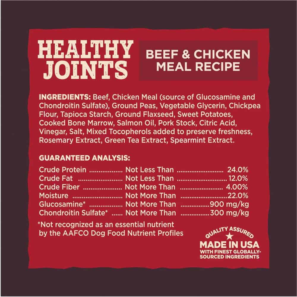 | Beef, Chicken Meal (source of Glucosamine and Chondroitin Sulfate), Ground Peas, Vegetable Glycerin, Chickpea Flour, Tapioca Starch, Ground Flaxseed, Sweet Potatoes, Cooked Bone Marrow, Salmon Oil, Pork Stock, Citric Acid, Vinegar, Salt, Mixed Tocopherols added to preserve freshness, Rosemary Extract, Green Tea Extract, Spearmint Extract. |
