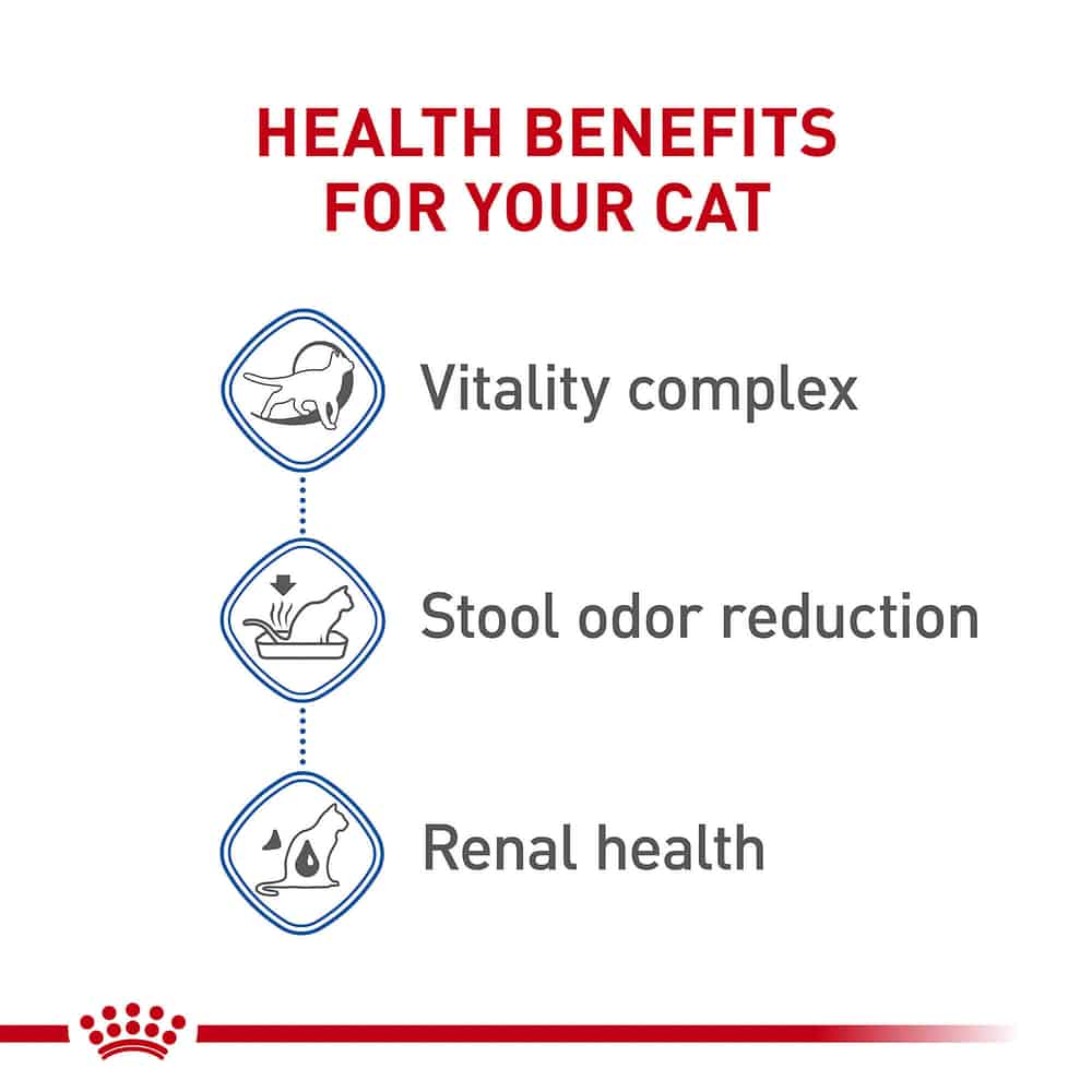 Mature cats face a unique set of health challenges and fewer playtime sessions can mean lower muscle mass. An older cat may have difficulty eating due to dental problems or a declining sense of smell and taste. And with a long life full of napping, grazing, and grooming, mature cats often have higher-than-healthy body weights and foul-smelling stool odor. What your cat eats can make all the difference.Royal Canin Feline Health Indoor 7+ Adult Cat Food is scientifically formulated for healthy aging cats 7 years and older.
