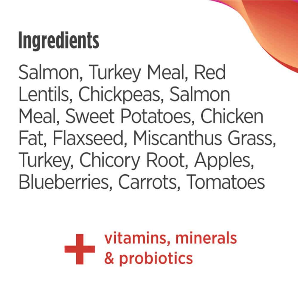 | Deboned Salmon, Turkey Meal, Red Lentils, Chickpeas, Salmon Meal, Sweet Potatoes, Chicken Fat (preserved with Mixed Tocopherols & Citric Acid), Ground Flaxseed, Ground Miscanthus Grass, Deboned Turkey, Natural Flavor, Potassium Chloride, DL-Methionine, Dried Chicory Root, Salt, Choline Chloride, Dried Apples, Dried Blueberries, Dried Carrots, Taurine, Dried Tomatoes, Calcium Carbonate, Vitamin E Supplement, Zinc Proteinate, Zinc Sulfate, L-Ascorbyle-2-Polyphosphate (source of Vitamin C), Iron Proteinate, Niacin Supplement, Ferrous Sulfate, Copper Proteinate, Copper Sulfate, Vitamin A Supplement, Manganese Proteinate, Thiamine Mononitrate (source of Vitamin B1), Calcium Pantothenate, Riboflavin Supplement, Pyridoxine Hydrochloride (source of Vitamin B6), Manganous Oxide, Biotin, Dried Bacillus coagulans Fermentation Product, Vitamin B12 Supplement, Vitamin D3 Supplement, Folic Acid, Sodium Selenite, Calcium Iodate, Rosemary Extract. |