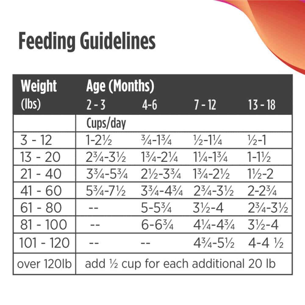 | 13 – 20 lbs. | 2 3/4 – 3 1/2 cups | 1 3/4 – 2 1/4 cups | 1 1/4 – 1 3/4 cups | 1 – 1 1/2 cups |