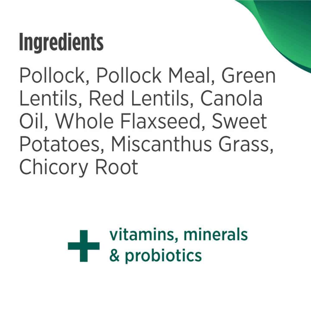 | Pollock, Pollock Meal, Green Lentils, Red Lentils, Canola Oil (preserved with Mixed Tocopherols & Citric Acid), Whole Flaxseed, Dried Sweet Potatoes, Miscanthus Grass, Natural Flavor, Potassium Chloride, Salt, Calcium Carbonate, Dried Chicory Root, Choline Chloride, Monosodium Phosphate, Vitamin E Supplement, Zinc Proteinate, Vitamin E Supplement, Zinc Sulfate, L-Ascorbyl-2-Polyphosphate (source of Vitamin C), Iron Proteinate, Niacin Supplement, Ferrous Sulfate, Copper Proteinate, Copper Sulfate, Vitamin A Supplement, Manganese Proteinate, Thiamine Mononitrate, Calcium Pantothenate, Riboflavin Supplement, Pyridoxine Hydrochloride, Manganous Oxide, Biotin, Dried Bacillus coagulans Fermentation Product, Vitamin B12 Supplement, Vitamin D3 Supplement, Folic Acid, Sodium Selenite, Calcium Iodate, Rosemary Extract. |