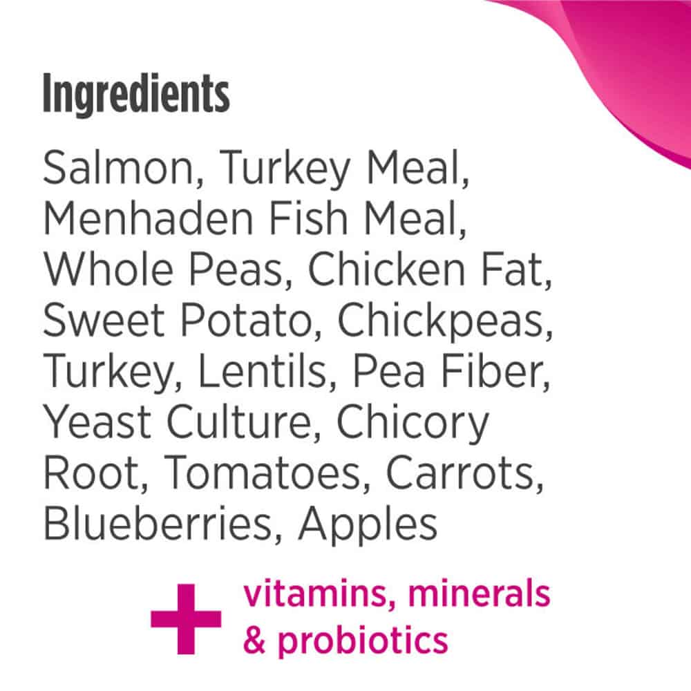 | Deboned Salmon, Turkey Meal, Menhaden Fish Meal, Whole Peas, Chicken Fat (preserved with Mixed Tocopherols & Citric Acid), Sweet Potato, Chickpeas, Deboned Turkey, Lentils, Pea Fiber, Natural Flavor, Yeast Culture, Dried Chicory Root, Dried Tomatoes, Dried Carrots, Dried Blueberries, Dried Apples, Salt, Calcium Carbonate, Choline Chloride, Potassium Chloride, Zinc Proteinate, Vitamin E Supplement, L-Ascorbyl-2-Polyphosphate (source of Vitamin C), Iron Proteinate, Niacin, Copper Proteinate, Thiamine Mononitrate (source of Vitamin B1), Calcium Pantothenate, Vitamin A Supplement, Manganous Oxide, Pyridoxine Hydrochloride (source of Vitamin B6), Sodium Selenite, Riboflavin, Vitamin D3 Supplement, Biotin, Dried Bacillus coagulans Fermentation Product, Vitamin B12 Supplement, Calcium Iodate, Folic Acid, Rosemary Extract. |