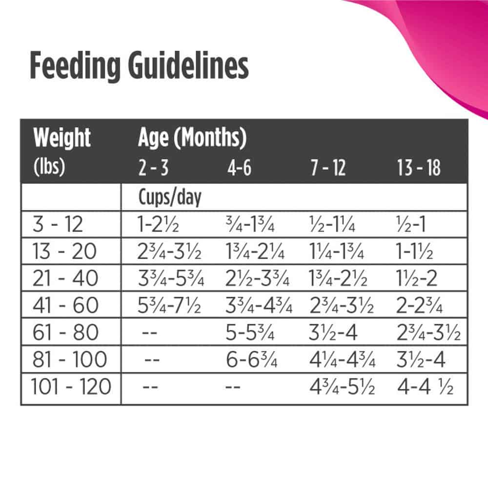 - Every puppy is a little different, so the ideal feeding amount may vary with age, size and activity level.