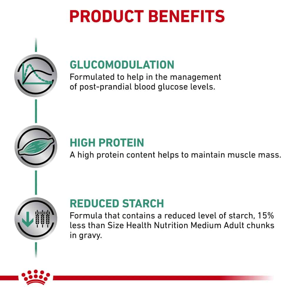 This diet has a high protein content to help maintain muscle mass, and it is rich in antioxidants to help maintain health and vitality. Glycobalance dry is formulated with a reduced level of starch, 15% less than Size Health Nutrition Medium Adult Chunks in Gravy.