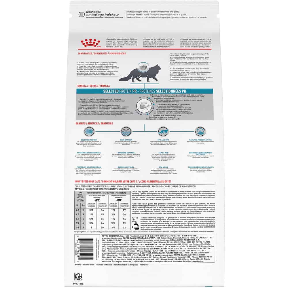 Whether a veterinarian has determined through an elimination diet trial that your cat has food sensitivities or they require long-term support for their skin issues, your vet recommended Royal Canin Selected Protein Adult PR dry cat food for a reason. This highly palatable, highly digestible, complete and balanced diet can help your cat live her most magnificent life.