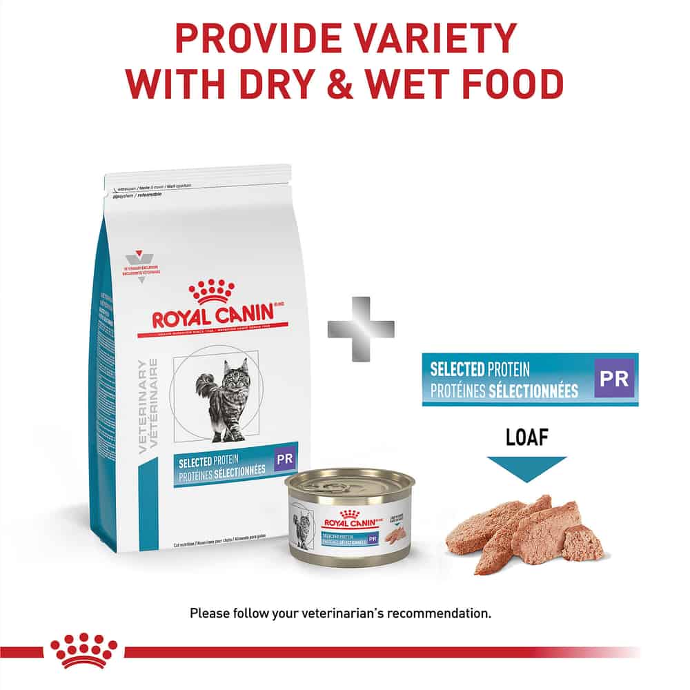 - When feeding Dry + Wet, this food is best mixed with Royal Canin Veterinary Diet Feline Selected Protein PR Loaf in Sauce Wet Cat Food.