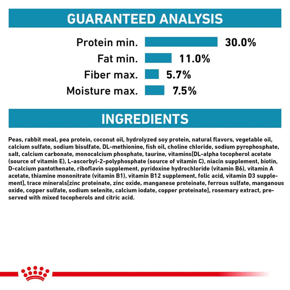 | Peas, rabbit meal, pea protein, coconut oil, hydrolyzed soy protein, natural flavors, vegetable oil, calcium sulfate, sodium bisulfate, DL-methionine, fish oil, choline chloride, sodium pyrophosphate, salt, calcium carbonate, monocalcium phosphate, taurine, vitamins [DL-alpha tocopherol acetate (source of vitamin E), L-ascorbyl-2-polyphosphate (source of vitamin C), niacin supplement, biotin, riboflavin supplement, D-calcium pantothenate, pyridoxine hydrochloride (vitamin B6), vitamin A acetate, thiamine mononitrate (vitamin B1), vitamin B12 supplement, folic acid, vitamin D3 supplement], trace minerals [zinc proteinate, zinc oxide, manganese proteinate, ferrous sulfate, manganous oxide, copper sulfate, sodium selenite, calcium iodate, copper proteinate], rosemary extract, preserved with mixed tocopherols and citric acid. |